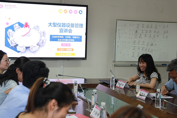 接着,实验室与装备处洪家祺老师从国家政策、学校政策以及信息化建设方面对大型仪器设备管理规定进行详细解读。洪老师指出资产购置之后如何发挥作用,如何为科研带来成效以及仪器设备开放共享的效益如何评价是资产全生命周期管理的最重要的环节。从国家政策层面和大环境情况上可以看出近些年来国家、相关部委和地方政府对于开放共享大型仪器设备建设越来越重视。随后,洪老师从落实查重评议,加强过程监督、大型仪器验收要求、大型仪器平台验收流程、仪器测试费收支分配比例、设立开发共享维修基金、大型仪器效益考核等方面解读了学校的相关政策。在信息化建设上,洪老师以常规数据上报工作、本校大型仪器共享平台建设情况简介、大型仪器开发共享保障机制、移动互联手机端“预约助手的建设情况、问题汇总等方面向与会老师进行系统功能演示和介绍。