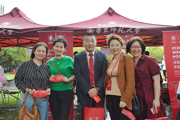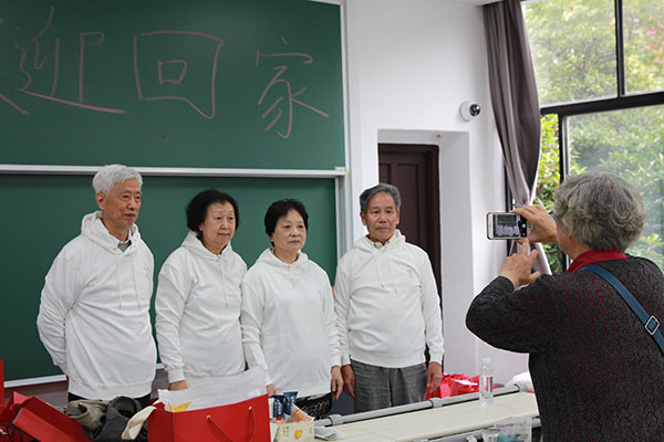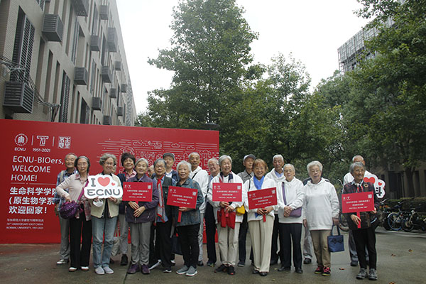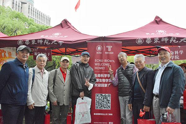 返校校友在闵行校区学院门口合影留念