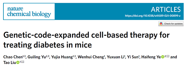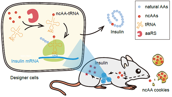 2021年11月15日,北京大学刘涛团队与av影片 叶海峰团队在Nature Chemical Biology杂志发表了题为Genetic code expanded cell-based therapy for treating diabetes in mice的研究论文。文章利用基因密码子扩展技术开发了非天然氨基酸调控的胰岛素细胞治疗系统(Noncanonical Amino acids (ncAAs)-triggered Therapeutic Switch, NATS),证明了该系统能够在翻译水平快速调控蛋白质表达(图1)。该研究补充了合成生物学中的蛋白调控开关工具库,也为基因密码子扩展技术的应用创新提供了新的思路。
