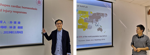 孙建建博士在博后期间的研究方向是心脏成纤维细胞参与调控心脏稳态和再生修复。他的报告题目是《Fibroblast shapes cardiac homeostasis and injury responses》,孙博士向大家介绍了成体心脏细胞的种类、比例、来源及功能,重点阐述了心脏成纤维细胞在心脏损伤修复中的功能。在他的研究中发现弹性假黄瘤综合征心脏病主要由ABCC6突变导致,表现为严重的心脏钙化/纤维化表型。研究以斑马鱼为模式动物,通过基因编辑技术构建abcc6突变体,发现abcc6基因通过调控EMT信号通路,激活心肌成纤维细胞过度分泌细胞外基质,导致心脏纤维化,并影响心脏的损伤修复反应,该研究为弹性假黄瘤综合征的诊断、治疗提供新的思路,
