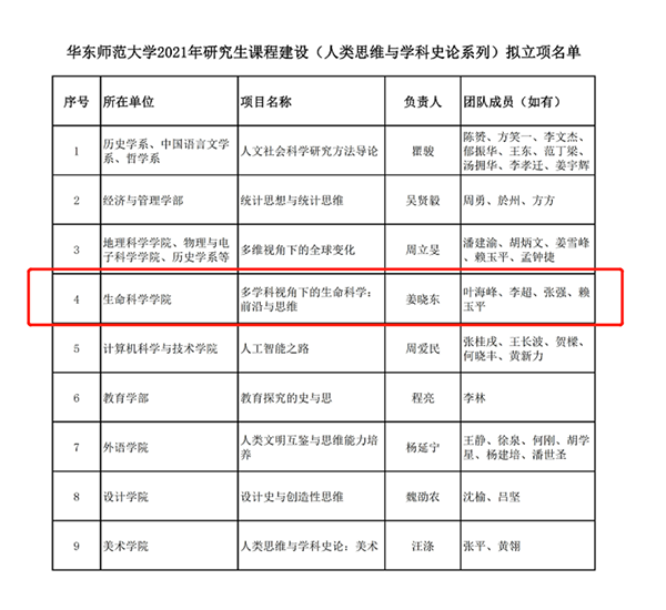 近日,研究生院公示了av影片 2021年研究生课程建设项目拟立项名单,经相关课程负责人申请、学部院系推荐,研究生院组织专家评审,av影片 研究生“人类思维与学科史论”课程《多学科视角下的生命科学:前沿与思维》获批立项。