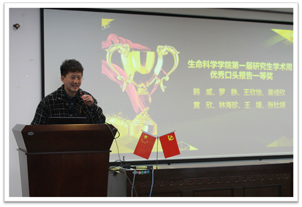 学术周优秀口头报告一等奖获得者韩威同学作为代表发言,他感谢了学院、老师的培养,分享了个人学习经历与感悟,表示不负青春、不忘感恩,在今后的科研道路上再接再厉、砥砺前行。