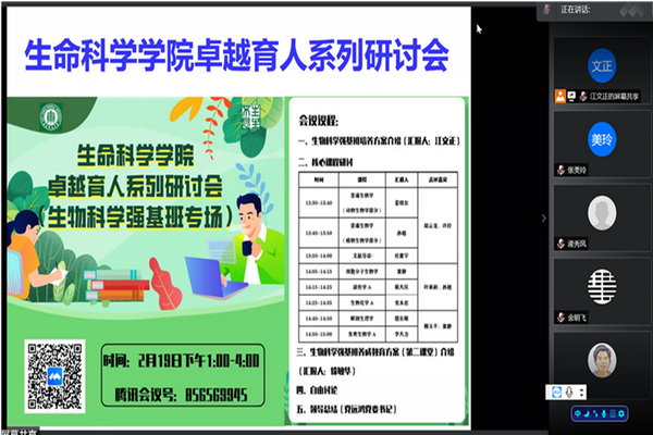 生物科学强基班是以培养具有科研潜质、能够成为国家生命科学领域科技创新后备人才为目标的拔尖人才培养基地。为了切实推进卓越育人工作,落实《av影片 关于开展卓越育人工作的通知》,加快推进建立新的课程规范和体系,av影片 于2021年2月19日下午在线上召开了卓越育人系列研讨会——生物科学强基班专场。av影片 全体党政班子成员、教学委员会全体委员、任课教师等70余人参加了会议。参加本次会议的还有学校教务处丁旵明老师、吴平颐老师、姚如佳老师、黄鲁霞老师,光华书院赵旌旌老师、谢雨杉老师及多名辅导员老师,生命医学教工第一党支部的全体党员教师也参与了此次研讨。