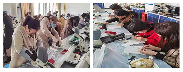 活动中,专业老师给大家讲授了珍珠的基本知识,珍珠是一种古老的有机宝石,可分为海水珠、淡水珠、人造珠三种类型。今天活动中的珍珠属于淡水珠,具体制作步骤分为开蚌,清洗,烘干,打孔,制作。在珍珠蚌用刀具打开的一瞬间,珠圆玉润的珍珠展现在大家眼前,大家都非常欣喜。大家将珍珠取出后,按照老师讲解的步骤细心地加工着各自心爱的宝贝,经过一番努力,一件件晶莹透亮的珍珠首饰终于做好了。成品非常美丽夺目,很多老师当场就戴上了自己亲手制作的耳环、胸针等。