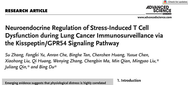 该研究成果日前在国际杂志Advanced Science上以“Neuroendocrine Regulation of Stress-Induced T Cell Dysfunction during Lung Cancer Immunosurveillance via the Kisspeptin/GPR54 Signaling Pathway” 为题发表,av影片 杜冰教授、刘明耀教授以及秦居亮副研究员为论文的共同通讯作者,av影片 博士生张苏和俞方菲为论文的共同第一作者。该研究受到国家重点研发计划、国家自然科学基金、上海市基因编辑与细胞治疗前沿科学研究基地、上海市教委科研创新计划项目的资助。