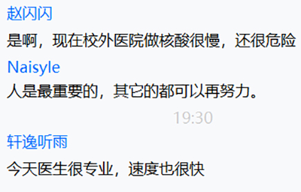 面对紧急的情况,学工部的老师们一直尽最大努力为同学们排忧解难,每天24小时待机状态,有任何消息都及时告知学生,始终把每个人的安全健康放在首位。关于核酸检测,我校获得宁光院士派遣的专业医护人员的帮助,最大程度上发挥核酸检测的效能,保证大家的安全。
