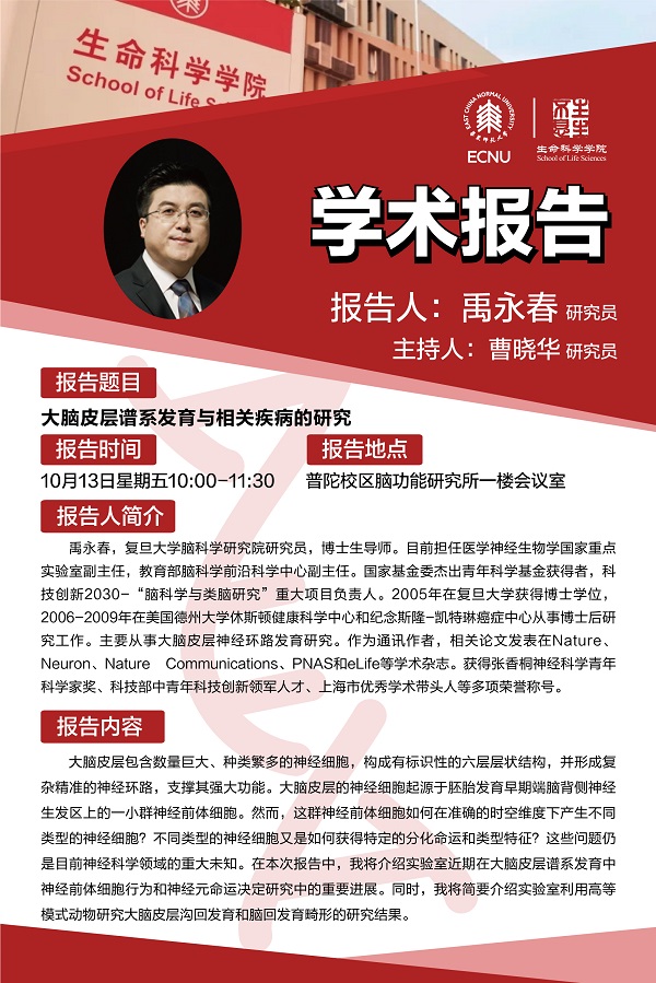 大脑皮层包含数量巨大、种类繁多的神经细胞,构成有标识性的六层层状结构,并形成复杂精准的神经环路,支撑其强大功能。大脑皮层的神经细胞起源于胚胎发育早期端脑背侧神经生发区上的一小群神经前体细胞。然而,这群神经前体细胞如何在准确的时空维度下产生不同类型的神经细胞?不同类型的神经细胞又是如何获得特定的分化命运和类型特征?这些问题仍是目前神经科学领域的重大未知。在本次报告中,我将介绍实验室近期在大脑皮层谱系发育中神经前体细胞行为和神经元命运决定研究中的重要进展。同时,我将简要介绍实验室利用高等模式动物研究大脑皮层沟回发育和脑回发育畸形的研究结果。
