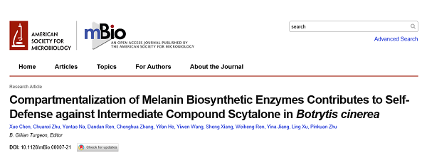 2021年3月23日,av影片 许玲教授课题组在微生物领域顶级刊物《mBio》上发表题为Compartmentalization of melanin biosynthetic enzymes contributes to self-defense against intermediate compound scytalone in Botrytis cinerea的研究论文,揭示了灰霉菌黑色素生物合成关键酶的区室化分布作用机制。华东师大为论文的唯一完成单位,av影片 博士研究生陈雪、硕士研究生朱传玺和那艳涛为论文的共同第一作者,朱品宽副教授为论文的共同通讯作者。该研究得到了国家十三五重点研发计划项目(2016YFD0400105)和国家自然科学基金(32061133006, 31571902, 31972121)的资助。(全文链接://doi.org/10.1128/mBio.00007-21)