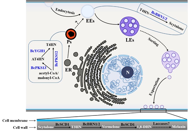 真菌黑色素是一种由酚类或吲哚聚合,并与糖类或蛋白质络合而成的高分子物质,参与真菌的抗逆性和致病性等多种生命活动。已知灰霉菌通过聚酮合酶途径合成DHN(二羟基萘)黑色素,然而关于灰霉菌黑色素的生物合成及其在细胞壁积累的细胞学调控机制仍不清楚。