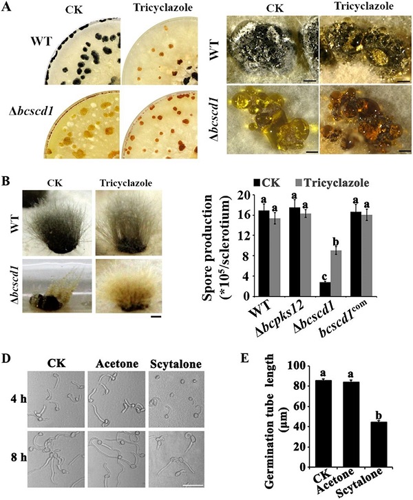 图1 灰霉菌黑色素合成途径重要酶缺失导致中间产物scytalone积累造成发育缺陷