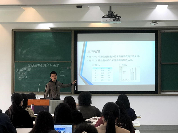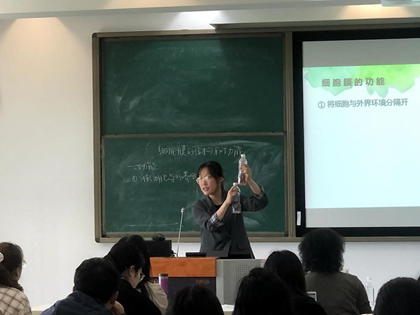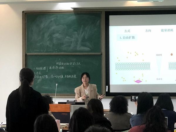 欧阳威同学的试讲主题是“主动运输与胞吞胞吐”。在引入环节,他首先回顾了被动运输的两种方式,并针对人体吸收碘这一特殊过程,提出被动运输的不足之处,从而引出主动运输形式。为了说明主动运输的必要性,欧阳威罗列了人体进行主动运输的实例,帮助学生构建更为完整的生命观念。通过让学生上台描绘曲线图提出了主动运输速率曲线的几种可能性,促进学生积极思考哪一种曲线是正确的。张文倩同学通过鸡蛋与卵黄膜的例子,开始了“细胞膜的结构与功能”的试讲。在课前,张文倩精心准备了浸泡花瓣的实验,通过用热水使花瓣细胞膜破裂导致色素逸出的现象,直观地为学生介绍了细胞膜的特点及功能。她巧妙地将细胞膜与纱窗进行对比,帮助学生掌握选择透过性这一易错概念。同时巧妙利用比喻,将细胞膜的信息交流功能比喻邮递信件,使抽象知识形象化,促进学生的理解。