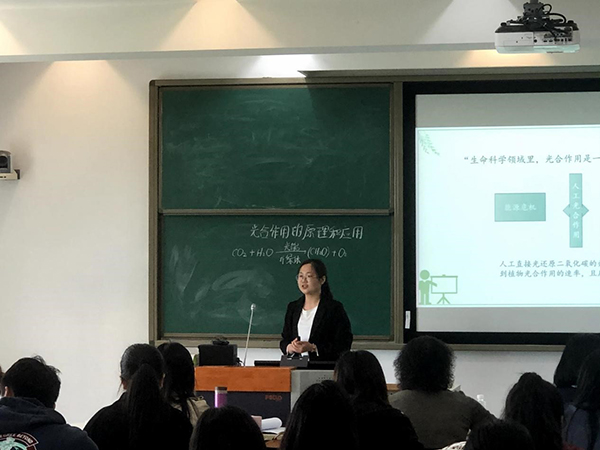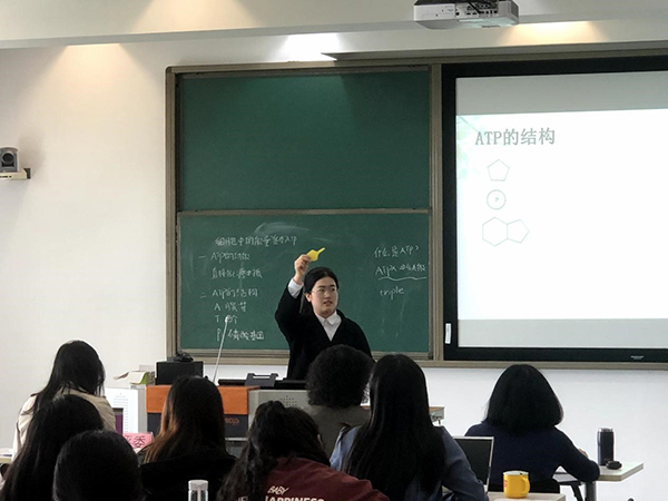 陈昕斓同学用知名动漫中出现的氰化物作为切入,通过氰化物阻止ATP合成而致死的原理,引入了“细胞中的能量货币ATP”的授课内容。她的引入贴近中学生的兴趣爱好,角度新颖,课程中,她向学生说明了ATP的基本结构,并在短暂记忆后通过练习进行强化。同时针对学生在练习中出现的错误进行有效的辅导与纠正。林榕煜作为上半场最后一位试讲选手,以“光合作用产生的氧气中的氧元素来自哪个反应物”的问题激发同学们的学习兴趣,通过鲁宾与卡门的同位素标记实验,让同学们讨论并得出结论。以科学史为线索,结合巧妙而形象的3D动画,林榕煜引导学生探究光反应的过程,发挥了学生的主观能动性。