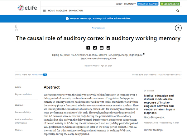4月29日,《eLife》期刊在线发表了题为《听皮层在听觉工作记忆中的作用》的研究论文,该论文由av影片 神经生物学/生理学专业许兢宏、俞黎平课题组完成,俞黎平副教授、硕士研究生胡家玮、史晨琳为论文共同第一作者,许兢宏副教授为论文的通讯作者。