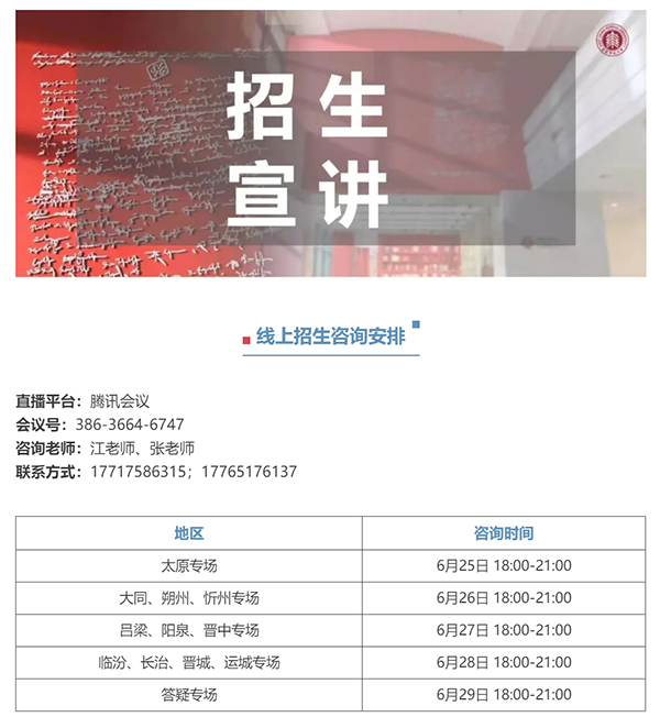 由于疫情影响,今年我校在山西省的高考招生工作主要在线上举行。从2022年6月25日到29日,高考招生小组针对山西省11个地市的考生和家长开展了为期5天的线上宣传,为考生和家长答疑解惑。同时,我们还通过QQ群、电话等途径为山西省考生或家长提供全天候的咨询。此外,我们还积极发动当地校友资源,协助高考招生工作的顺利开展。