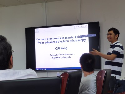 崔勇教授详细地介绍了高压冷冻及冷冻替代技术、3D电子断层扫描技术和场发射扫描电子显微镜技术,并讲解了这些技术是如何在研究拟南芥根细胞液泡的性质和生物发生中应用的,展示了精美的细胞断层扫描图片和3D结构图片,研究证明了植物初生小液泡(直径介于400纳米至1000纳米)是由多囊泡体融合衍生而来。同时,崔老师还介绍了冷冻电镜断层成像(cryo-ET)技术,并对其未来在细胞液泡相关研究中的应用进行了介绍。