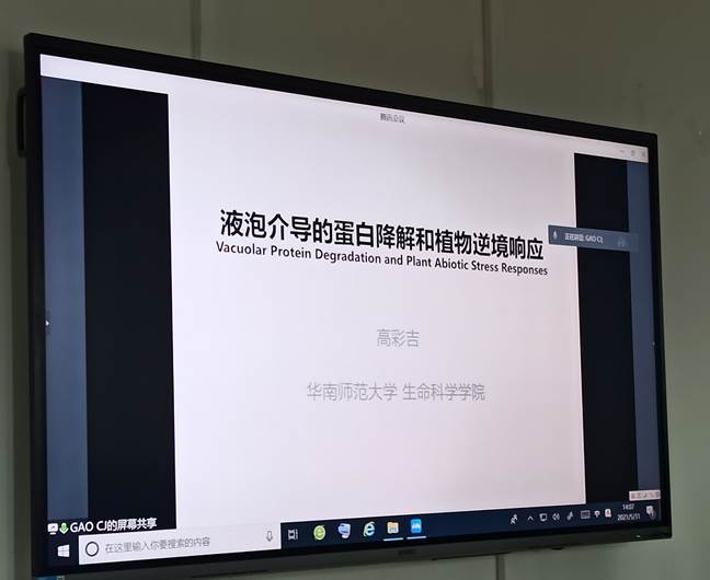 2021年5月31日,华南师范大学高彩吉教授在线上为av影片 师生做了题为“植物液泡介导的降解途径调控机制”的学术报告。本次报告由赵琼研究员主持,av影片 植物学科李小芳教授、晏军研究员、孙越副教授等老师及生科院的同学们参加了本次报告,报告还吸引了来自上海交大的数位相关领域老师的参与。