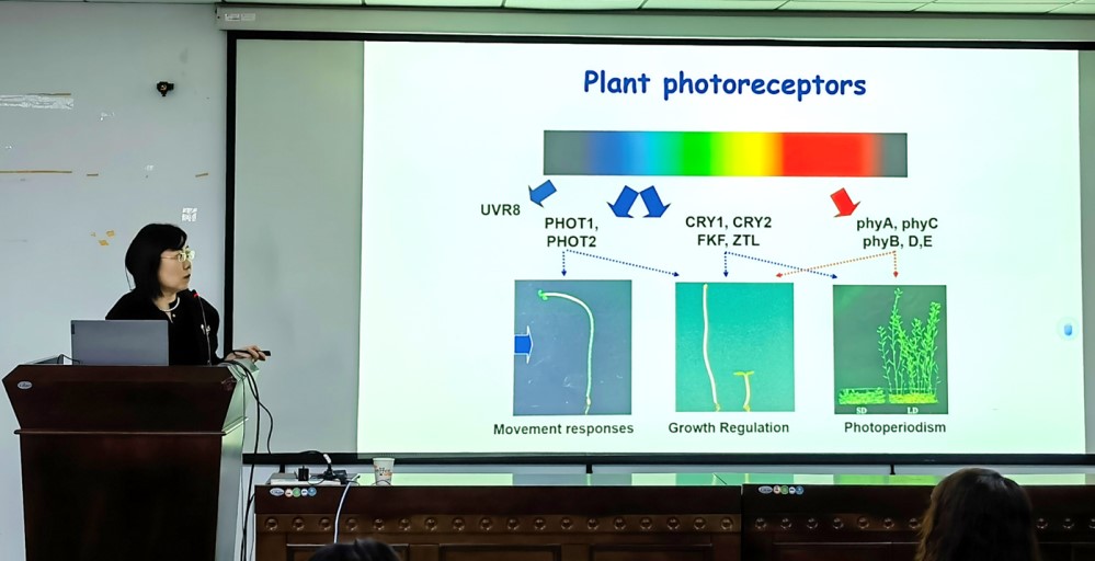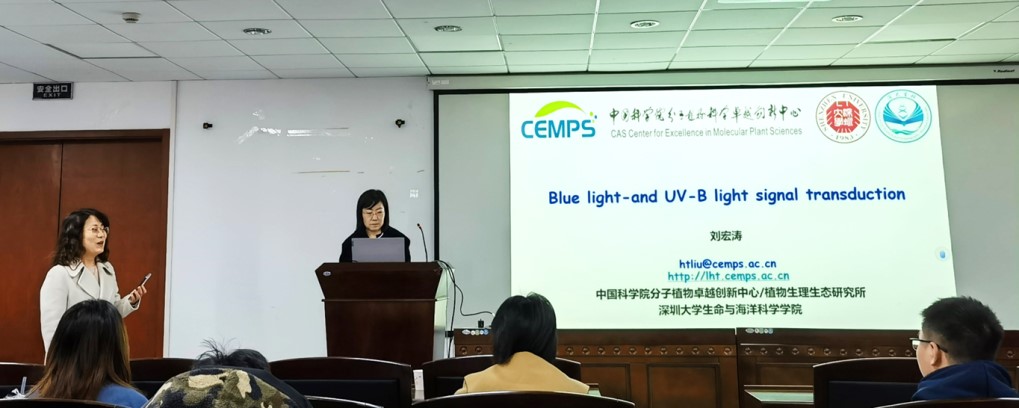 2023年11月24日上午,深圳大学生命与海洋科学学院院长刘宏涛教授应邀为av影片 植物学专业学生做主题为《植物的“眼睛”》的报告。刘宏涛教授长期从事植物光生物学研究,围绕植物光信号转导取得一系列原创性研究成果,发现并阐明光调控植物发育的分子机制。先后获得国家基金委杰出青年基金,优秀青年基金,重点,原创探索,国家WR计划科技创新领军人才,科技部推进计划中青年科技创新领军人才,以及中国青年科技奖、中国青年女科学家奖等多项奖励和荣誉。多篇论文发表在Developmental Cell, Nature Plants, Nature Structure & Molecular Biology, EMBO Journal, PNAS, Plant Cell等国际著名专业期刊。本次报告由av影片 植物学学科主任李超研究员主持,av影片 植物学专业晏军教授、李小方教授、孙越副教授等多名老师及硕博研究生参加了该次报告。