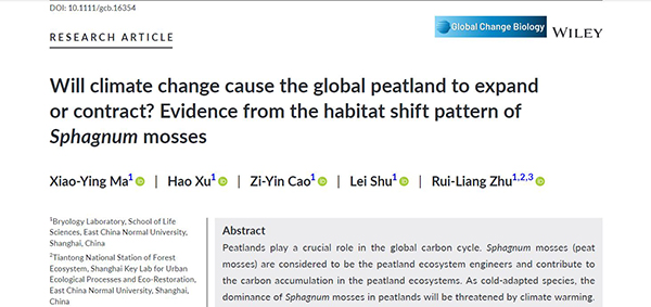 该成果以“Will climate change cause the global peatlandto expand or contract? Evidence from the habitat shift pattern ofSphagnummosses”为题于7月28日在线发表在 Global Change Biology 。论文的第一作者为博士研究生马晓英,通讯作者为av影片 朱瑞良教授,硕士生徐浩和曹子寅以及舒蕾讲师参与了本项研究。