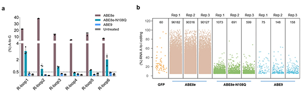 DNA碱基编辑器是一种创新的基因组编辑工具,它可以在不产生DNA双链断裂(DSB)、不需要供体DNA模板的情况下高效地催化碱基转换,因此在种质改良和基因治疗中被寄予厚望。碱基编辑技术最早由哈佛大学David R. Liu团队开发,他们通过将Cas9酶活突变型蛋白(nickase Cas9)分别与胞嘧啶脱氨酶或者腺嘌呤脱氨酶融合开发出初代的胞嘧啶碱基编辑器(Cytosine base editor, CBE)和腺嘌呤碱基编辑器(Adenine base editor, ABE)[1, 2]。由于碱基切除修复通路的激活,CBE除了诱导C到T的碱基转化,也会一定程度上产生非T的副产物和Indels (插入和缺失事件)。且最近高彩霞、杨辉等课题组陆续报导了CBE处理的细胞和胚胎中存在严重的随机脱靶现象[3, 4]。与CBE不同的是,第一代的ABEs (如ABE7.10, ABEmax) 几乎只产生纯的A到G的转换(≥99.9%),而不诱导显著的Indels (通常≤0.1%)[2]。更重要的是,ABE7.10极少诱导非Cas9依赖的脱靶编辑。这些优秀的特性使得ABEs在未来的临床应用中有许多优势。然而,ABE7.10的编辑效率对于很多靶点而言不尽如人意,David Liu等课题组通过分子进化获得了更高活性的ABE8 (ABE8e和ABE8s)[5, 6],但是ABE8并没有解决ABE原有的缺陷。例如,ABE会引起的大量随机的RNA脱靶编辑。此外,由于ABE8编辑窗口变宽,还会引起非目标碱基改变而产生旁观者效应以及ABE会在特定的TCN motif的背景序列中诱导胞嘧啶碱基的转换[6-8]。