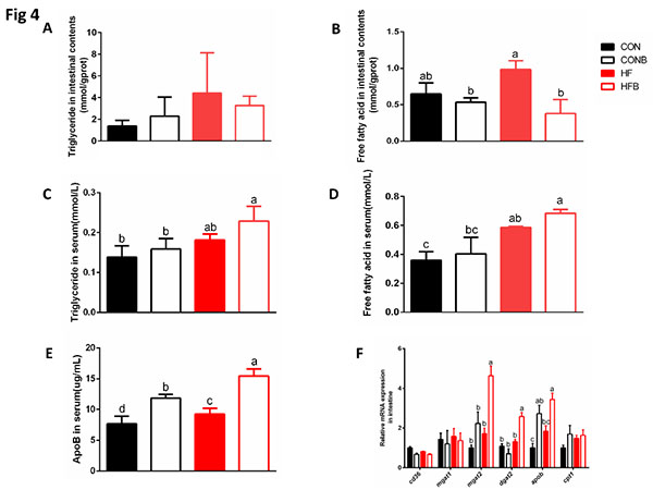 4.高脂饲料中添加S1细菌会促进罗非鱼肠道对甘油三酯的吸收和转运效率,增加肠道通透性,加剧摄入脂肪在腹腔中的积累;