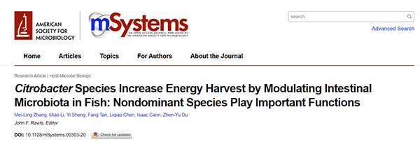 Zhang ML, Li M, Sheng Y, Tan F, Chen LQ, Cann I, Du ZY (2020) Citrobacter spp. increase energy harvest by modulating intestinal microbiota in fish: nondominant species play important functions. mSystems 5:e00303-20. DOI:10.1128/mSystems.00303-20.