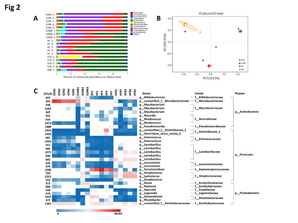 为了研究该菌的生物学效应,课题组将它以一定浓度添加到对照饲料和高脂饲料中(CON组:对照饲料投喂;CONB组:对照饲料+ S1细菌;HF组:高脂饲料;HFB组:高脂饲料+ S1细菌),饲喂罗非鱼8周。然后对四个处理组罗非鱼肠道中的柠檬酸杆菌丰度进行定量分析,结果表明:高脂饲料组的柠檬酸杆菌的种群水平较对照组显著增加,说明高脂饮食有助于提高柠檬酸杆菌属细菌在体内的丰度(图2)。此外,与HF组相比,S1菌株的添加显著地增加了HFB组柠檬酸杆菌属的丰度。但是,进一步的高通量测序结果却显示,该菌在鱼肠道中并不是优势菌群。(图2, 图3)