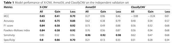 生物医学信息学的发展十分依赖其相关领域的发展。随着信息技术的快速发展,人们开始集中于考虑如何将先进的信息技术应用到生物医学信息的研究领域当中。目前,机器学习技术已经成为了数学信息学和计算机科学中的研究热点,而且也已经被成功地应用到了很多研究领域当中。为了构建机器学习模型并准确预测CNV的致病性,石教授团队前期做了大量的准备工作。在研究初期,整个团队在多数据集中分别收集了约1万个致病的CNV和约2万个明确不致病的CNV,同时还通过整合多种类型的数据源构建了30多种特征。此外,为了计算CNV在自然人群中的突变频率,团队还收集并标准化了来自8万多人,共约1400万条的CNV。通过模型训练、独立验证和性能对比,石教授团队的研究结果证明了X-CNV模型相较于现有的方法具有显著优势(如下表)。