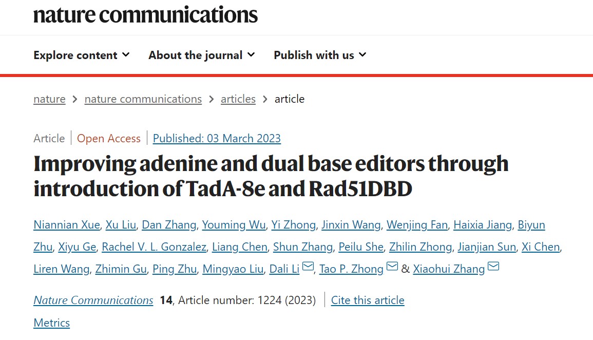 2023年3月3日,av影片 /上海市基因编辑与细胞治疗前沿科学基地张晓辉(现为中国医学科学院苏州系统医学研究所PI)、钟涛和李大力,在《自然通讯》杂志上发表了题为 “Improving adenine and dual base editors through introduction of TadA-8e and Rad51DBD” 的科学论文。开发了具有超高活性的腺嘌呤单碱基编辑器 (hyABE),极大地提高了靠近PAM区A-to-G的转换效率,扩大了编辑窗口。同时,作者又研发了超高活性的嘌呤嘧啶双碱基编辑器(eA&C-BEs和hyA&C-BEs),大幅提高A-to-G和C-to-T(A/C)同时编辑效率,并首次证明在斑马鱼胚胎中具有A/C同时编辑功能,展现了新型腺嘌呤碱基编辑器 hyABE在构建点突变疾病模型中的优势。