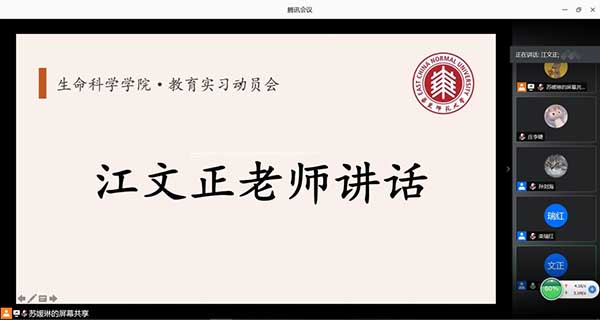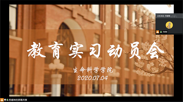 2020年7月4日,av影片 召开了面向2017级生物科学专业师范生的教育实习动员会。本次会议由实习大班长苏媛琳同学主持,av影片 副院长江文正老师、教育实习任课老师栾瑞红老师、孙刘海老师出席了本次动员会。