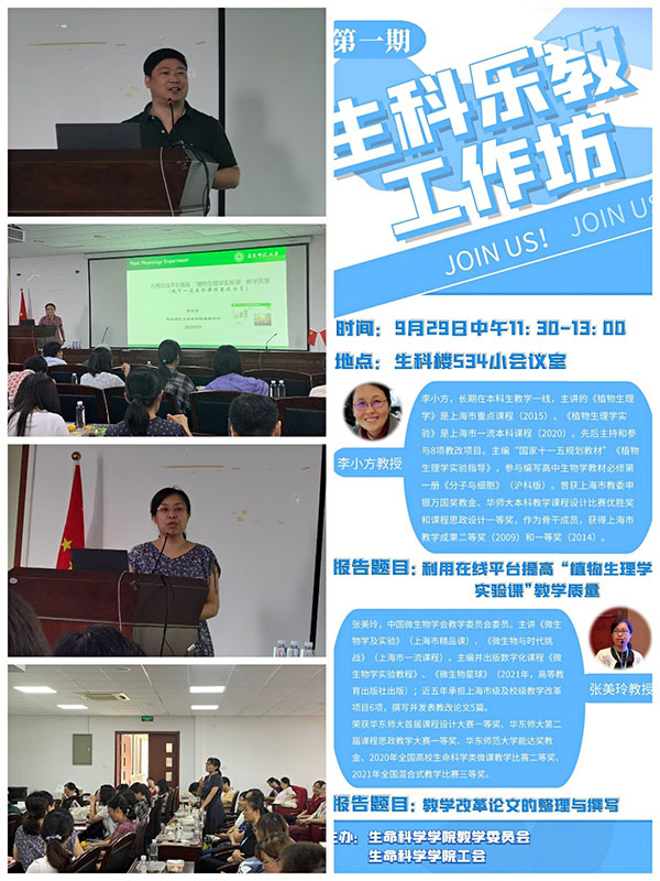 “知之者不如好之者,好之者不如乐之者”,为了进一步加强学院一线教师的教学改革经验交流,av影片 首届“生科乐教工作坊”教学研讨活动于2021年9月29日顺利举行。本次活动由av影片 教学委员会和av影片 工会联合主办,学院分管教学副院长江文正老师主持本次活动。李小方教授和张美玲教授分别做了题为《利用在线平台提高“植物生理学”教学质量》和《教学改革论文的整理与撰写》的报告。