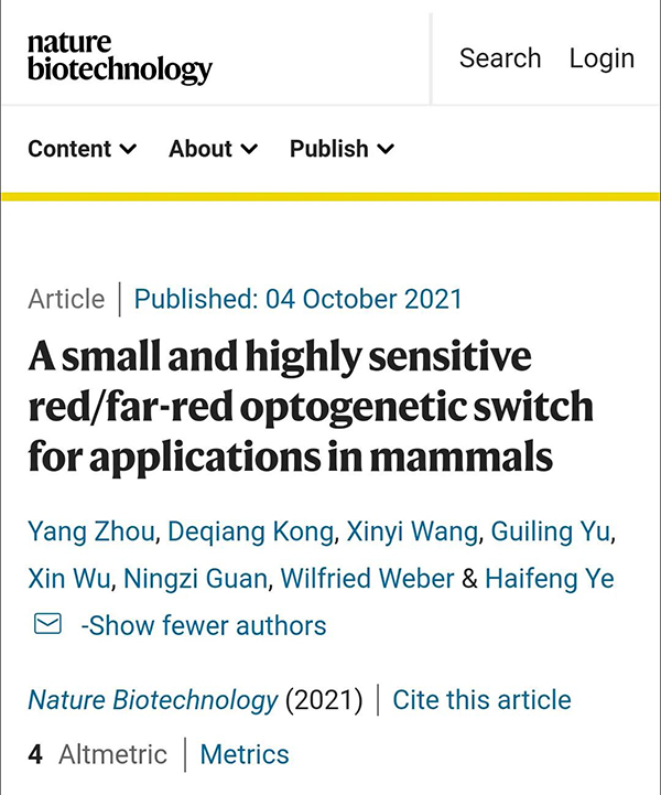 在体内提前“埋进”一个感光开关:660纳米(红光),打开,730纳米(远红光),关闭。10月4日,国际顶刊《自然·生物技术》刊登av影片 叶海峰团队在光遗传学领域的研究成果,介绍这种全新的生命“光开关”的创造和验证过程。