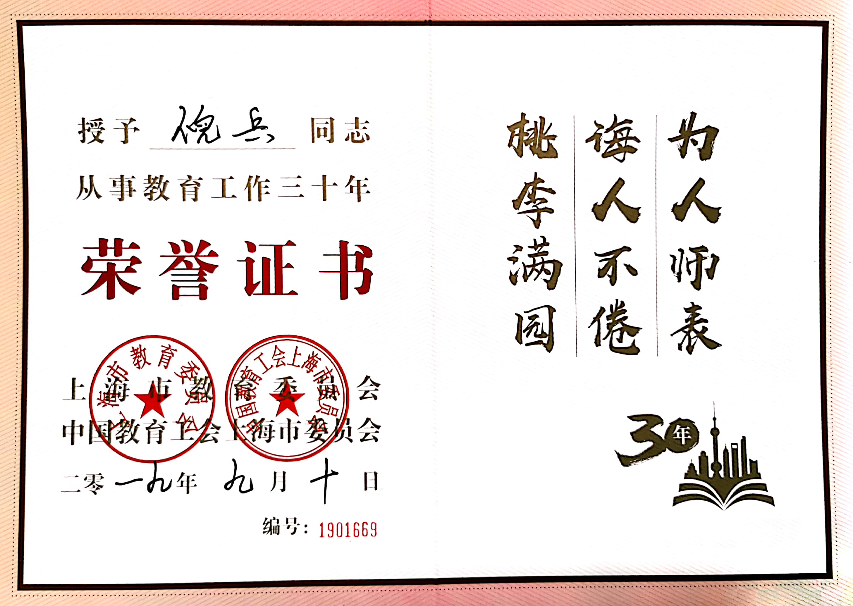 近日,上海市教育委员会、中国教育工会上海市委员会为av影片 高级工程师倪兵老师颁发了从事教育工作三十年荣誉证书。该证书旨在表彰爱岗敬业、尚礼育人、乐于奉献、具有立德树人的使命感与责任感的长期坚守在教育岗位上的老教师们。