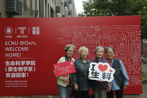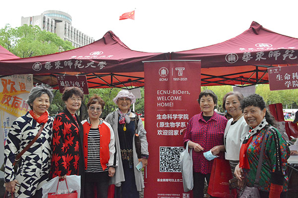 返校校友在闵行校区学院门口合影留念