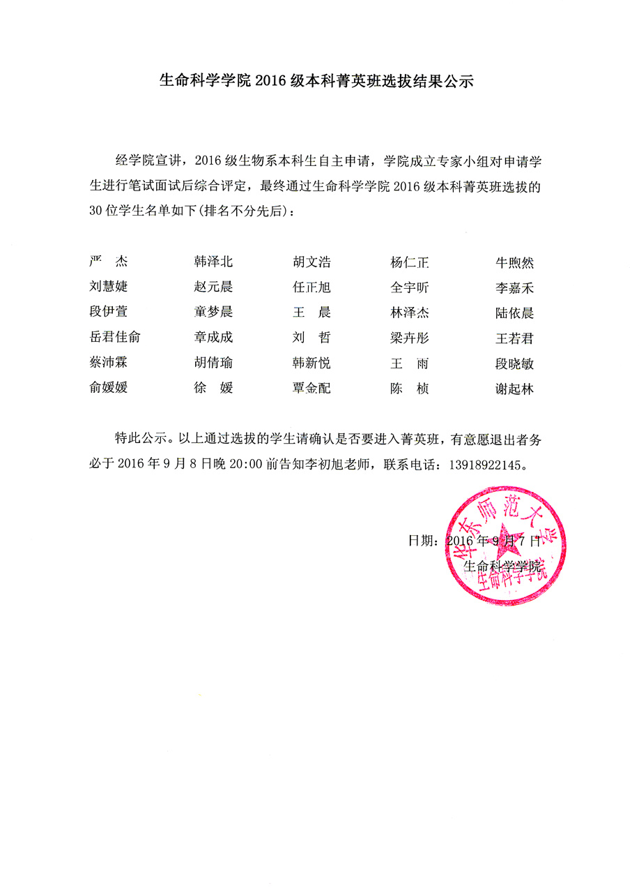 2016级av影片 菁英班,选拔结果通过学院官网,宣传栏以及2016级本科生通知群进行公示,公示内容如下所示: