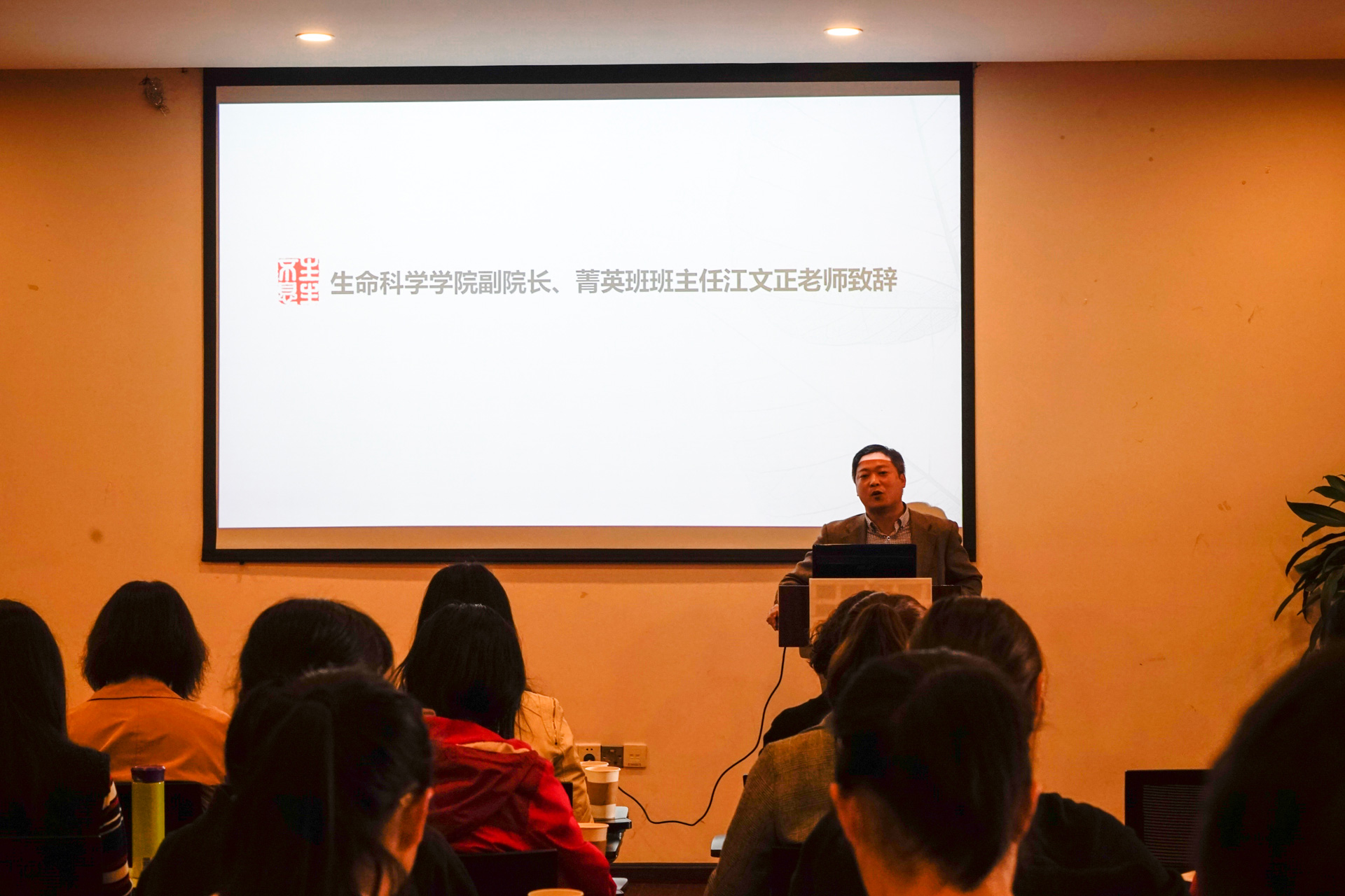 副院长、菁英班班主任江文正老师致辞时强调:“我们培养的学生不应只是学术上的精英,也应该有完善的理想信念和过硬的思想素质。因此,作为教师党员,我们还应该多多引导学生,万万不能忽视思政教育。”