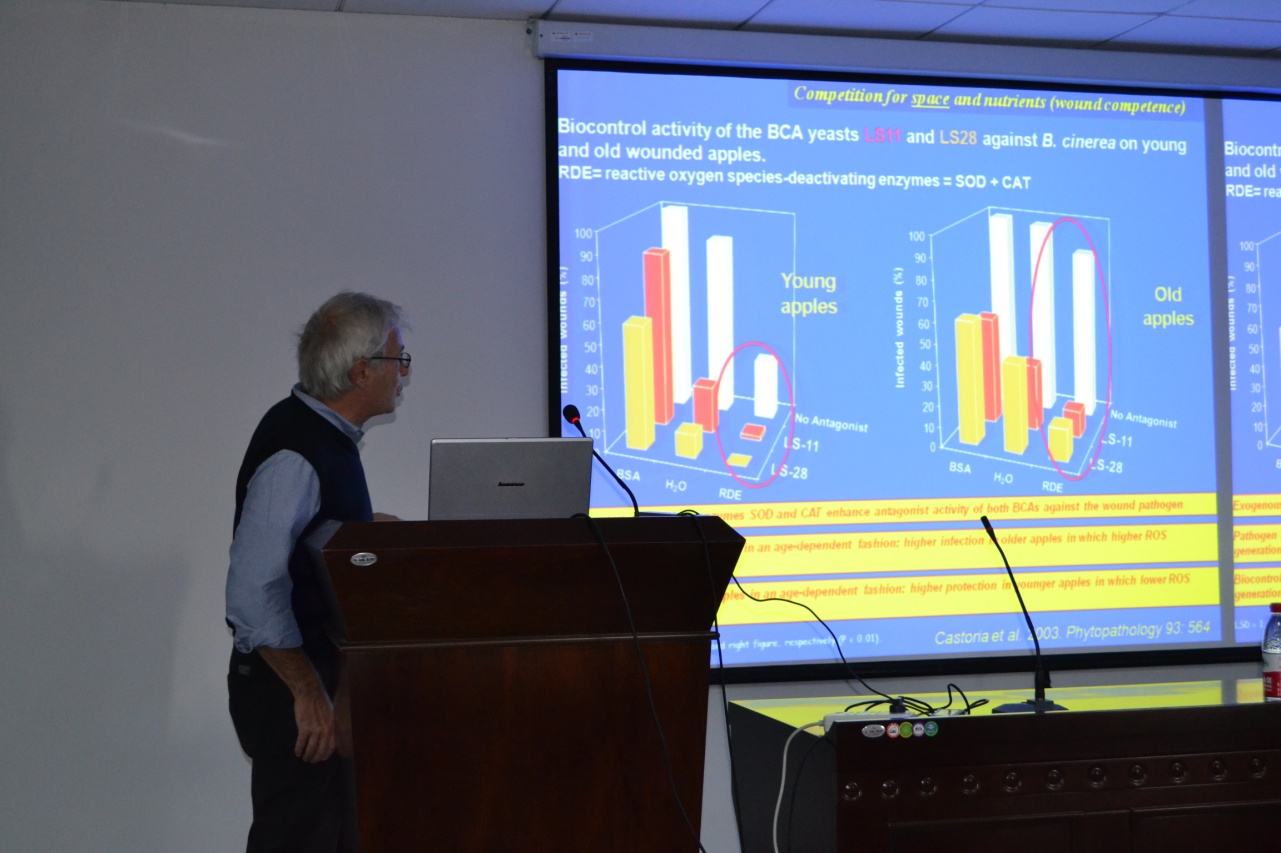 Castoria教授此次学术报告的题目为" Biological control of (mycotoxigenic) postharvest fungal pathogens "。报告主要阐述了利用具有生物防治作用的酵母菌防治采后果实的真菌性病害,强调了这种酵母菌在此过程中的作用机制,以及果实组织、真菌病原体、生物防治酵母菌三者之间复杂的相互作用。报告还阐述了生物防治酵母菌在防治真菌毒素污染方面的可能性以及目前发现的相关机制。报告结束后,Castoria教授与师生进行了热烈的讨论和交流,不仅使同学们认识了生物防治的新方法,同时也使同学们在科研思路、科研方法上有了新收获。