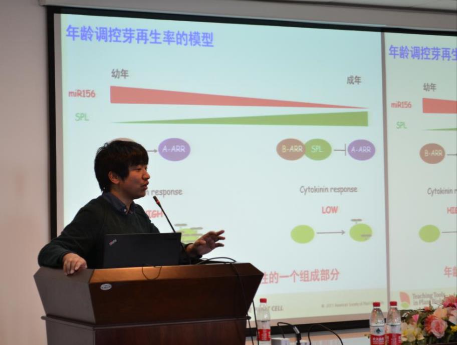为本科生和研究生开设的《植物生物学研究进展》课程的特邀专题讲座,王佳伟首先介绍了小RNA(miRNA)的定义和特点及功能,在大家更好地理解小分子RNA是如何调控生长发育的机理基础上,重点阐释了miR156与植物年龄信号之间的关系。在植物体内,miR156控制了幼年期到成年期的转化,miR156的表达量随着年龄的增长而逐渐减少,调控了植物生长发育和环境应答等多个过程。它是目前唯一已知的年龄分子标记,并提出了糖是一个保守的年龄信号,利用卡路里限制模型和人类的年龄途径相联系,引起了大家进一步的讨论和交流。