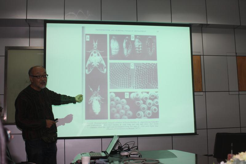 何祝清工程师邀请他的博士导师,日本神户大学的竹田真木生教授来院讲学,竹田真木生教授以“Molecular Mechanism of Photoperiodism Controlling Pupal Diapause in Antheraea pernyi: Clock, Counter, Endocrine Switch and Roles of Indolamine Pathways”(光周期控制柞蚕蛹滞育的分子机理:生物钟、应对反应、内分泌转换以及吲哚胺途径的作用)为题,为大家带来了一场精彩的学术讲座。讲座由何祝清工程师主持,何琳副教授和昆虫组以及其他实验室的研究生同学一同聆听了讲座。