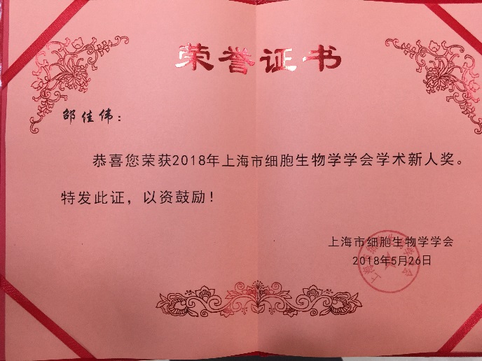 2018年5月26日,上海市细胞生物学学会举办的 “第十四届细胞生物学青年论坛”吸引众多青年研究生与青年科研工作者的踊跃参与,成为一次碰撞思想、启迪创造性的盛会。经过初审,本次论坛优选了12个研究生和青年科研工作者口头交流报告,最终评选出“学术新人奖”3名、“优秀青年学者”1名、技术创新奖1名。av影片 叶海峰课题组2016级博士生邵佳伟,以题为“Smartphone-controlled Optogenetic Designer Cells for Diabetes Therapy”做口头汇报,在入选的12位研究生中脱颖而出,荣获此次青年论坛的“学术新人奖”。