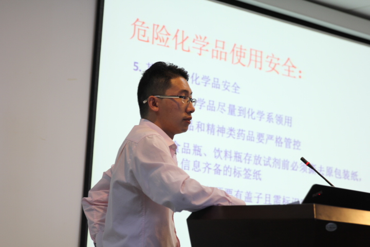 实验室安全负责人刘碧胜老师从仪器设备的使用安全、用电安全、危化品安全、生物安全等角度系统全面地为学生讲解了基本的实验室安全知识以及遇到安全事故如何处理等问题。随后他又讲解了公共区域精密实验仪器的规范操作,强调每个学生都有责任维持公共安全秩序和保持公共环境卫生,共同营造干净舒适的实验环境。