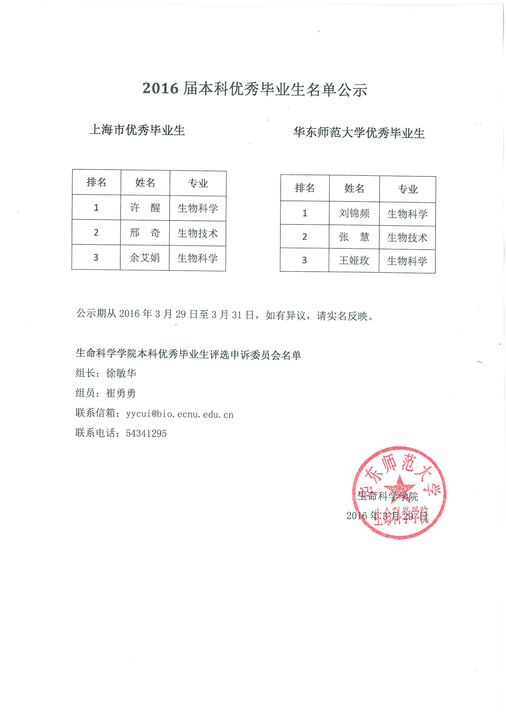 2016年本科优秀毕业生名单公示