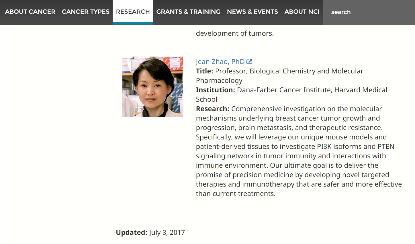 NCI(National Cancer Institute)隶属于美国国立卫生研究院 (National Institutes of Health, NIH),是全美癌症研究和资助的主要机构。该奖项专门授予在癌症研究领域做出突出贡献的研究人员,是该领域的顶级奖项。获奖者均是为生物医学、生物行为学和临床癌症研究等领域取得突破性贡献的研究先行者,其中大多是科学院院士级的大腕明星科学家。该年度与赵景教授同时获奖的还有来自斯坦福大学的Ronald Levy教授, 来自斯隆凯特琳癌症中心的Neal Rosen博士和来自康奈尔医学院的Lewis Cantley教授等。